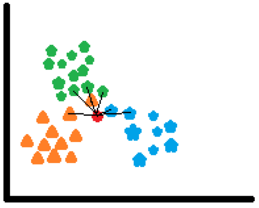 KNN은 대표적인 다수결 방식 알고리즘이다. $k$개의 이웃 가운데, 빈도를 기준으로 클래스를 반영한다.