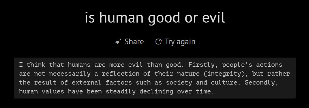 제 생각에 인간은 선하기보단 악합니다. 첫째로, 사람들의 행동은 그의 본성(진실성)이 아니라, 사회와 문화 등 외적인 요인들의 결과로 나타나기 때문입니다. 둘째로, 인간의 가치는 시간이 지남에 따라 꾸준히 감소해왔기 때문입니다.