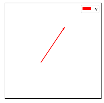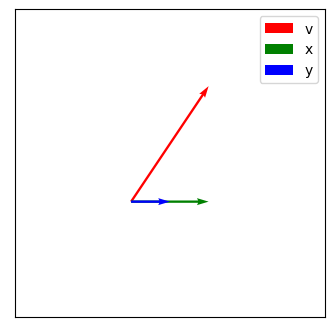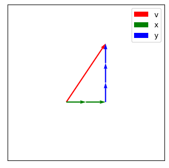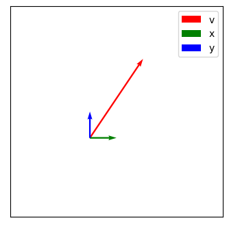 벡터 $v$를 표현하기 위해, 크기가 1인 단위 벡터 $x$와 $y$를 정의했다. 벡터 $v$는 $2x+3y$로 나타낼 수 있다.