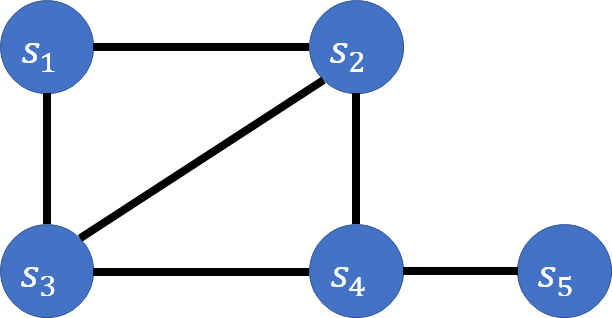 한 대학에서 과목 $s_1,s_2, \cdots, s_5$의 시험을 본다고 하자. 아래 그래프에서, $s_a$와 $s_b$ 사이의 간선은 두 수업을 동시에 수강하고 있는 학생이 있음을 나타낸다.