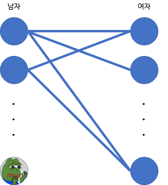 왼쪽의 노드들이 우리나라의 남자들, 오른쪽의 노드들이 우리나라의 여자들이고, 각 간선이 서로가 사귄 경험을 나타낸다고 보자. 2020년 8월 기준으로 그래프는 다음 수치를 갖는다.