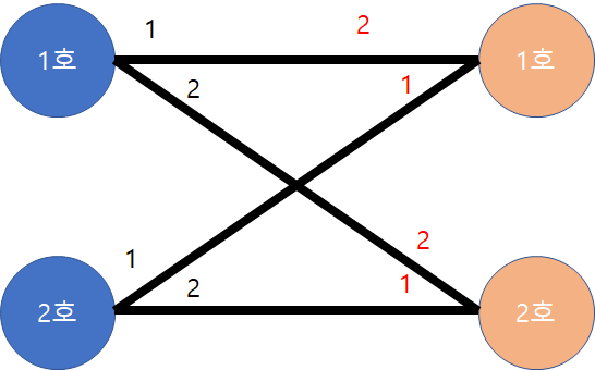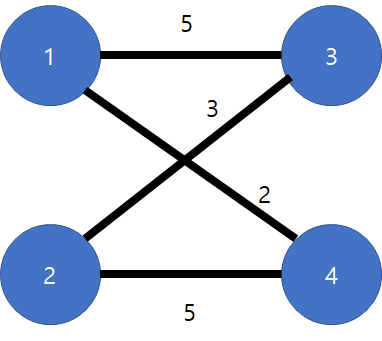 2대2 소개팅을 가정해보자. 왼쪽 두 노드는 남자, 오른쪽 두 노드는 여자를 의미하고, 간선의 숫자는 우선순위이다.