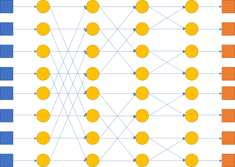 | Butterfly | $2+\log_2 N$ | $2\times 2$ | $N(1+\log_2 N)$ | $\sqrt{N}$ or $\sqrt{N/2}$ |