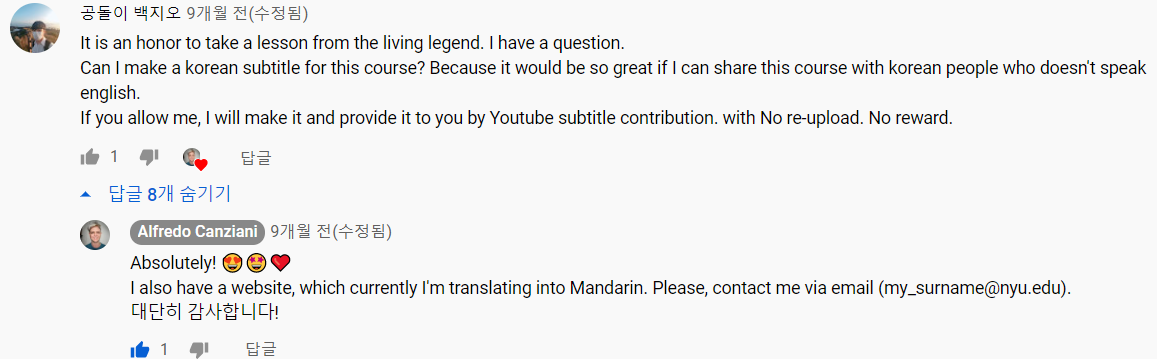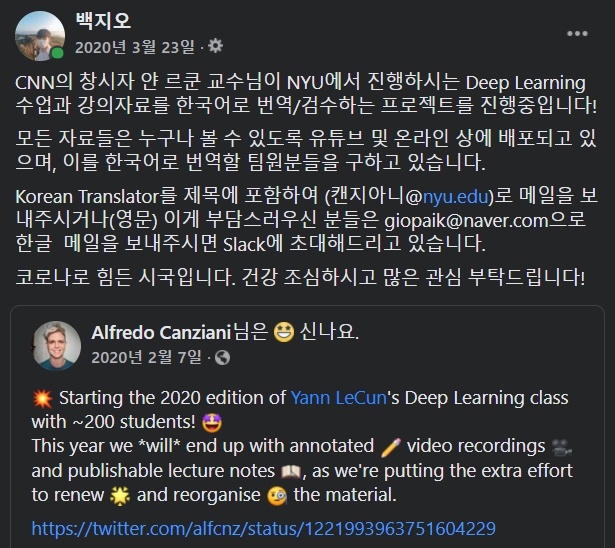 얀 르쿤 교수님의 강의를 온라인으로나마 들을 수 있단 사실에 감동받아 이 강의를 한글로 번역해보고 싶다는 댓글을 남겼는데, 얀 르쿤 교수님과 딥러닝 강의를 진행하는 Alfredo님과 연락이 닿았다.