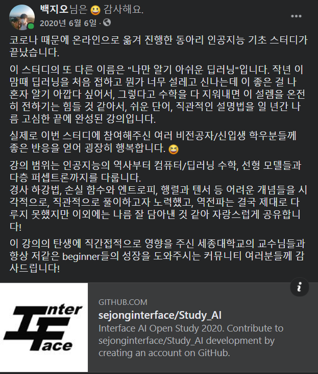 2019년에도 동아리에서 딥러닝 스터디를 운영했지만, 당시에는 나도 많이 미숙했고 딥러닝 입문서를 읽고 따라 하는 수준으로 스터디를 진행했었다. 2020년에는 아예 각 잡고 진행하고자 마음먹고 교내 프로그래밍 동아리에서 딥러닝 강의를 개설했다.