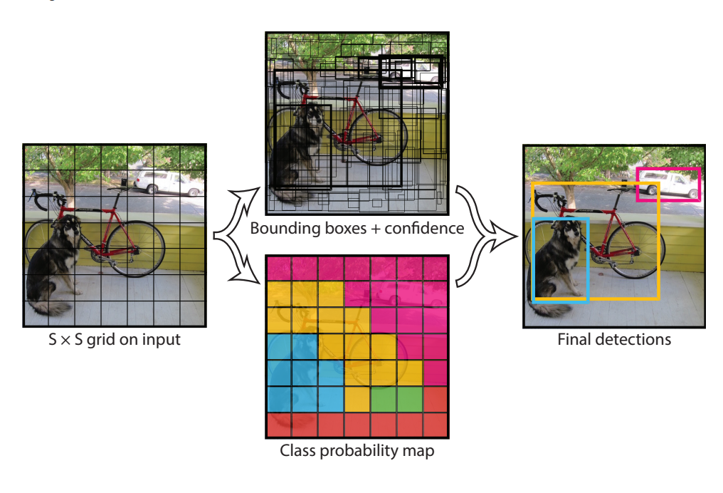 먼저, 입력 이미지를 $S \times S$개의 grid로 분할한다. (위 이미지 좌측)