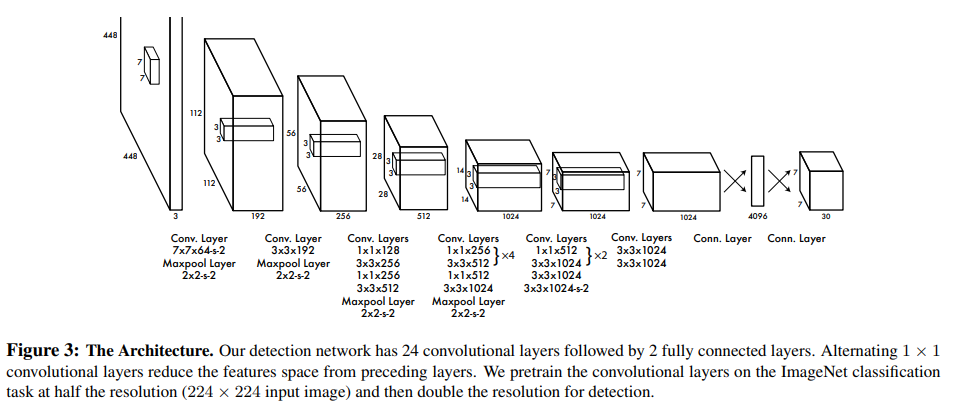Image Classification에서 사용되는 GoogLeNet을 약간 변환한 구조로, 24개의 합성곱 계층과 2개의 Fully Connected 계층으로 구성된다.
