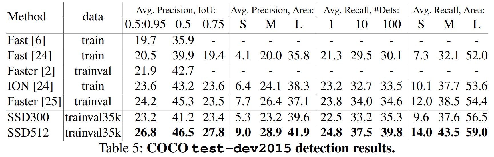 우리는 $10^{-3}$ learning rate로 160000회, $10^{-4}. 10^{-5}$로 각각 40000회 학습을 진행했다. 표 5에 그 결과가 나타나있다. PASCAL VOC의 결과와 비슷하게, SSD300은 Fast R-CNN에 비해 mAP@0.5, mAP[0.5:0.95]에서 앞선 결과를 보였다. SSD300은 ION, Faster R-CNN과 비슷한 mAP@0.75를 내었으나, mAP@0.5는 더 낮았다. 이미지 크기를 늘리자 SSD512는 Faster R-CNN보다 좋은 성능을 내었다. 흥미롭게도, SSD512는 mAP@0.75에서는 5.3% 나은 성능을 보여줬지만, mAP@0.5에서는 1.2%만 앞섰다.