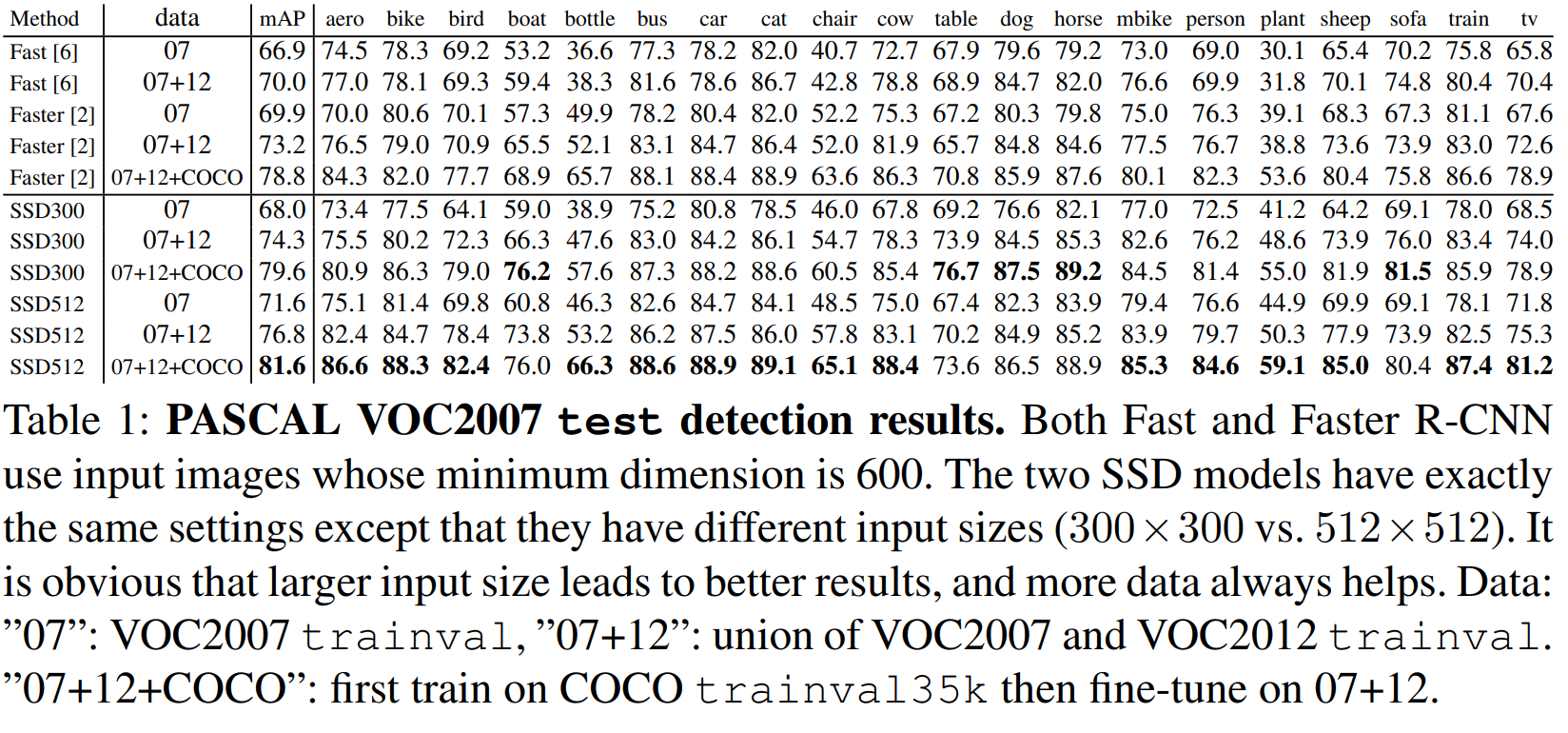 SSD는 $300 \times 300$ 크기의 VOC2007 입력에서 74.3% mAP를 달성하였고, Nvidia Titan X GPU에서 59FPS의 속도를 내었다. $512 \times 512$ 크기의 입력에서는 76.9% mAP를 달성하여 이전 SOTA였던 Faster R-CNN 모델을 앞선 성능을 달성하였다.