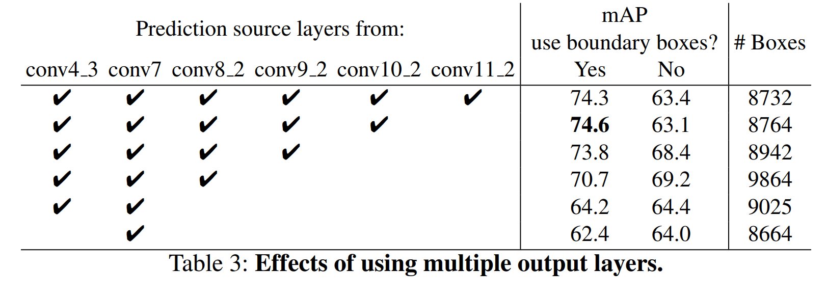 각기 다른 해상도의 output layer 여러 개를 사용하는 게 좋다. SSD의 주요 contribution은 다양한 스케일의 default box들을 다양한 output layer에 적용한 것이다. 이 방법의 장점을 측정하기 위해, 우리는 각 계층을 점진적으로 제거하며 결과를 비교해 봤다. 공정한 비교를 위해 매번 계층을 제거할 때마다, 남아있는 계층의 box들의 스케일이나 비율 등을 추가하고 조정하며 default box의 총량(8732)은 비슷하도록 조정을 가했다.