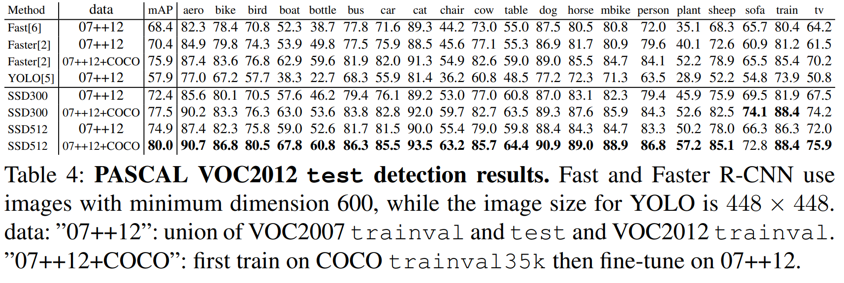 모델은 $10^{-3}$의 learning rate로 60000번, $10^{-4}$로 20000번 학습했다. 표4는 SSD300과 SSD512 모델의 실험 결과를 보여준다. VOC2007에서의 실험과 비슷한 성능 증가폭을 확인할 수 있다.SSD300은 Fast/Faster R-CNN의 성능을 뛰어넘었다. 데이터의 크기를 $512 \times 512$로 증가시키자, SSD는 Faster R-CNN보다 $4.5%$ 높은 정확도를 얻었다. YOLO와 비교하여도 SSD는 더욱 정확하였고, COCO 데이터셋까지 더하자 SSD512는 $80.0%$ mAP를 달성하였다.