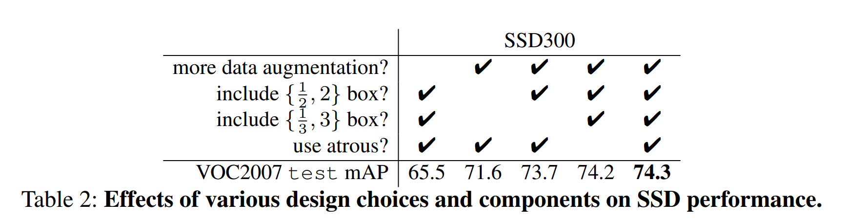 SSD를 더 잘 이해하기 위해, 모델의 각 부분이 성능에 얼마나 영향을 주는지 분석하였다. 모든 실험을 위해 우리는 실험 내용과 유관한 설정을 제외하고 입력 크기 $(300\times300)$를 포함해 모두 같은 설정을 사용하였다.