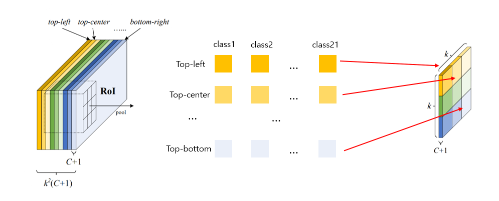 ROI Pooling을 거쳐 얻은 $K$개의 ROI에 대해, $k\times k (C+1)$ 채널의 feature map으로부터 ROI속 $k\times k$격자 속값들을 뽑아내어 $k\times k$크기의 feature map을 $(C+1)$ 채널 수만큼 만든다.
