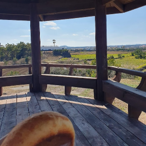 바다와 산이 모두 보이는 정자에 올라가, 감자빵을 꺼내어 먹었다.