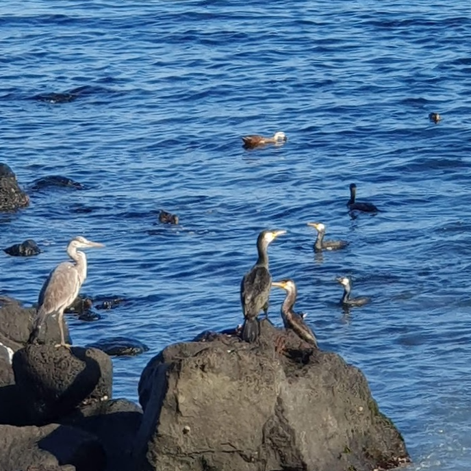 길을 따라 걸으며 바닷가를 보니 왜가리와 가마우지, 오리들이 와글와글 모여 사냥을 하고 있었다.