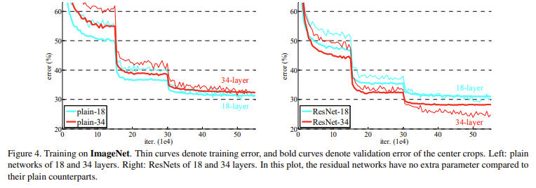 ImageNet 데이터에서 각각 18개, 34개의 계층을 갖는 일반적인(Plain) 신경망과 ResNet구조의 신경망의 비교를 수행하였다.