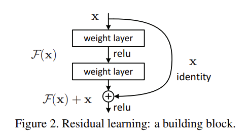 $$ \mathbf{y} = \mathcal{F}(\mathbf{x}, (W_i)) + \mathbf{x}$$