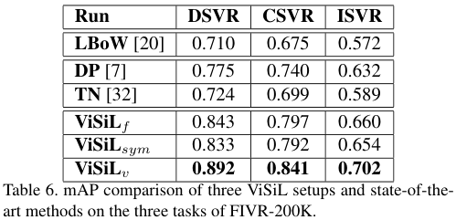 NDVR task에서, 기존에 좋은 성능을 낸 모델인 Deep Metric Learning, Circulant Temporal Encoding, 그리고 DP와 TN의 재구현 버전과의 비교를 수행한 결과, ViSiL이 크게 앞선 성능을 보였다. 다만, CC_WEB_VIDEO 데이터셋의 라벨 오류를 포함한 경우에서만 CTE 모델이 더 좋은 성능을 내었고, 이 오류를 고친 결과 ViSiL이 가장 좋은 성능을 내었다.