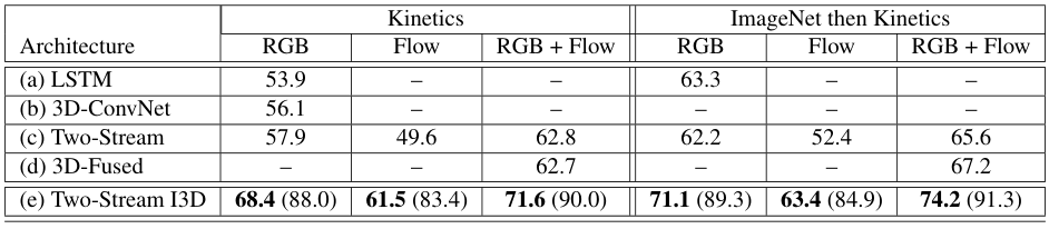 저자들은 이러한 실험 과정에서 알아낸 사실들을 바탕으로 새로운 Two-Stream Inflated 3D ConvNets(I3D)라는 구조를 제안하였다.
