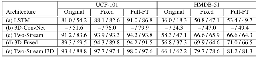 original은 ImageNet 사전학습을 진행하지 않은 것이고, fixed는 kinetics에서 사전학습 후 모델을 freeze 하고 마지막 계층만 주어진 데이터에 맞게 파인튜닝한 모델, Full-FT는 kinetics 사전학습 후 전체 모델을 파인튜닝한 모델의 결과이다. 저자들이 만든 Kinetics 데이터셋이 ImageNet처럼 general video task의 성능을 향상하는 역할을 잘하고 있다.