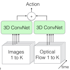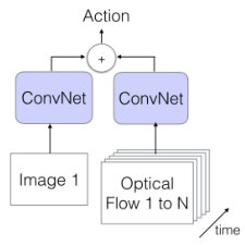 이 방법은 영상에서 한 장의 이미지와, Optical Flow를 이용한다. Optical Flow는 이전 프레임과 현재 프레임 사이에서 각 픽셀이 이동한 것을 모션벡터로 나타낸 2채널 이미지 형태이다. Two-Stream 방법은 이 Optical Flow 10개를 채널 축으로 쌓은 데이터와 한 장의 RGB 이미지를 ImageNet에서 학습된 2D 합성곱 계층을 통해 처리하고, 두 특성을 합쳐 사용한다. 이 방법은 학습과 추론이 매우 간편하며, 높은 성능을 보이는 편이라고 한다.