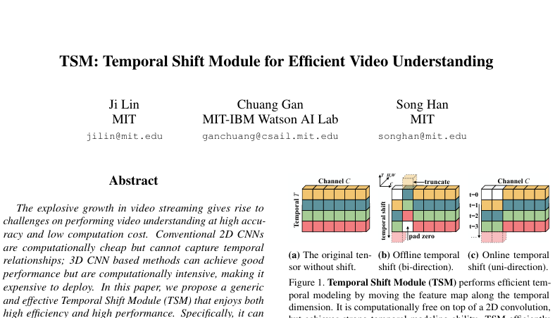 이 논문에서는 동영상 분석에 2D 합성곱 신경망을 사용하여 높은 속도를 얻으면서도 동영상의 시간적 정보 손실을 최소화하기 위해 Temporal Shift Module을 제안하였다. 이 모듈은 프레임의 일부 채널에 시간 축에 대한 shift를 가하여 2D 이미지인 상태로 시간적 정보를 주입하고, 2D CNN이 공간적 정보뿐만 아니라 시간적 정보까지 활용할 수 있도록 한다.