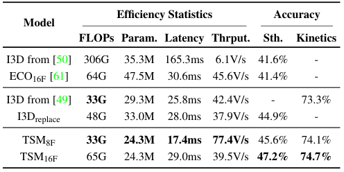 <표 2>, <표 4>, <그림 6>에서 나타난 것처럼, TSM은 타 모델들 대비 적은 연산량(FLOPs)과 Latency, 좋은 Throughput을 갖는다. TSM은 특히 효율성을 중시하여 설계된 ECO보다도 성능이 좋으며, I3D와는 비슷한 연산량을 갖지만 2D 합성곱이 하드웨어 친화적이기 때문에 더 좋은 속도를 보인다.