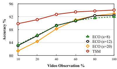 또한 TSM은 좋은 Early Recognition 성능을 갖는다. Early Recognition이란 영상의 일부만을 보고도 영상을 분류하는 것을 의미하는데, <그림 7>은 TSM의 Early Recognition 성능이 ECO에 비해 높으며, 특히 영상의 10%만을 보고도 90%에 가까운 정확도를 보임을 알 수 있다.