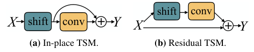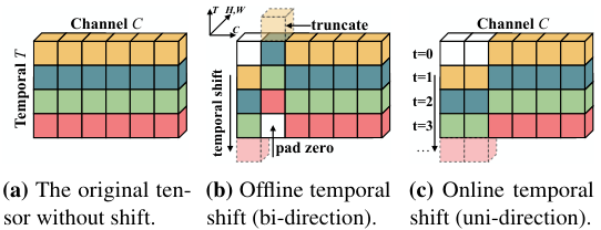 저자들은 영상의 일부 채널들을 시간축으로 Shift 하는 Temporal Shift를 적용하여 2D 합성곱으로도 시간적 정보를 얻을 수 있도록 하는 Temporal Shift Module(TSM)을 제안한다. 이때, 일반적으로는 각 채널을 시간축으로 $\pm 1$만큼 이동시키지만<그림 1의 (b)>, 실시간 스트리밍에서는 미래의 프레임을 미리 가져올 수 없기 때문에 한 방향으로만 이동시킨다.<그림 1의 (c)>
