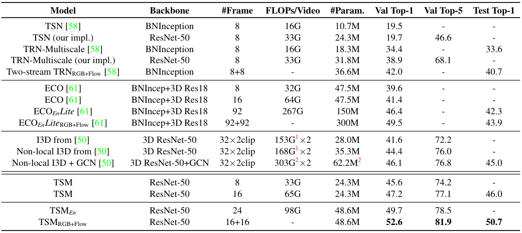 저자들은 Temporal Segment Networks(TSN)라는 2D CNN 구조를 Baseline 삼아 다른 모델들과 비교를 수행하였다. 실험 결과에서 TSM은 저자들이 TSN 구조에 TSM을 접목하여 실험한 결과이다.