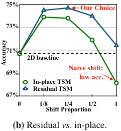 Residual Shift를 적용한 결과 이를 적용하지 않은 In-Place TSM 대비 성능이 향상되었으며, 특히 Shift Proportion이 1까지 높아져도 shift를 적용하지 않은 모델에 비해 좋은 성능을 내었다. 저자들은 실험을 통해 가장 좋은 성능을 보인 1/4 Shift Proportion을 사용하였다.