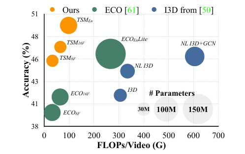 2D CNN구조는 직관적이며, 효율적이지만 3D CNN에 비하여 시간적인 관계를 추론하지 못한다. 한편 3D CNN은 시공간적 특성을 모두 파악할 수 있지만 더 많은 파라미터를 갖기 때문에 무겁고, 오버피팅에 취약하다. 한편 TSM은 3D CNN과 같이 시공간적 특성을 얻을 수 있으면서도 2D CNN과 같은 컴퓨팅 자원을 요구한다.