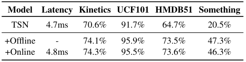 <표 5>를 보면, Onlnie TSM 모델이 2D baseline인 TSN 대비 0.1ms의 Latency만 증가하면서도 25%가량의 성능 향상을 이루는 것을 볼 수 있다.