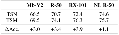 저자들은 MobileNet-V2, ResNet-50, ResNext-101, ResNet-50 + Non-local module과 같이 다양한 backbone에 TSM을 적용하였고, 그 결과 <표 3>처럼 성능의 향상이 있었으며, 이미 시간적 정보를 얻을 수 있는 NL R-50에서도 성능이 개선되었다.
