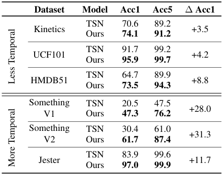 저자들이 제안한 모델은 다른 2D CNN 모델 대비 연산량 증가 없이 더욱 높은 성능을 보였다. <표 1>에서 TSN에 단순히 TSM을 추가하기만 하였음에도 성능이 향상되었음을 볼 수 있다. 특히, 시간적 정보가 중요한 Something-Something, Jester 데이터셋에서 성능이 크게 향상되었다.