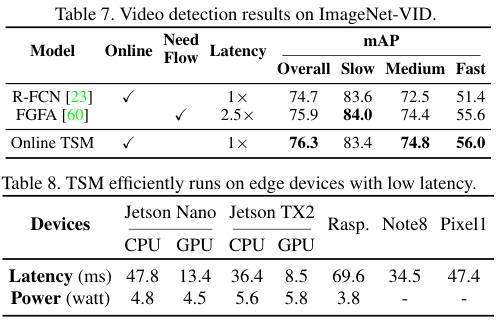 TSM은 Edge Device에서 적은 Latency와 power를 사용하며 높은 성능을 보인다. TSM은 특히 ImageNet-VID 데이터셋에서 빠르게 이동하는 물체들을 잘 잡아내었다.