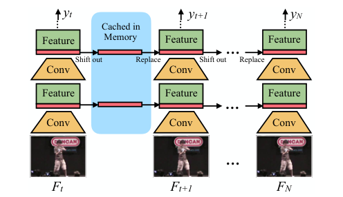 한편 online 환경에서의 실시간 영상을 처리할 때는 미래의 프레임을 가져올 수 없기 때문에 <그림 5>와 같이 TSM은 단방향 구조로 작동한다. 이때 현재 프레임의 feature map의 1/8은 캐시해 두었다가 다음 프레임의 TSM 연산에 사용한다.