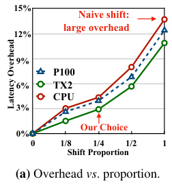 데이터 이동으로 인한 오버헤드를 줄이기 위해, 저자들은 전체 채널 중 shift를 적용하는 채널의 비율인 Shift Proportion을 적절하게 설정하여 오버헤드를 최소화하면서 성능은 최대화하고자 하였다. <그림 2>에서 Shift Proportion에 따른 오버헤드와 정확도의 변화를 볼 수 있다.