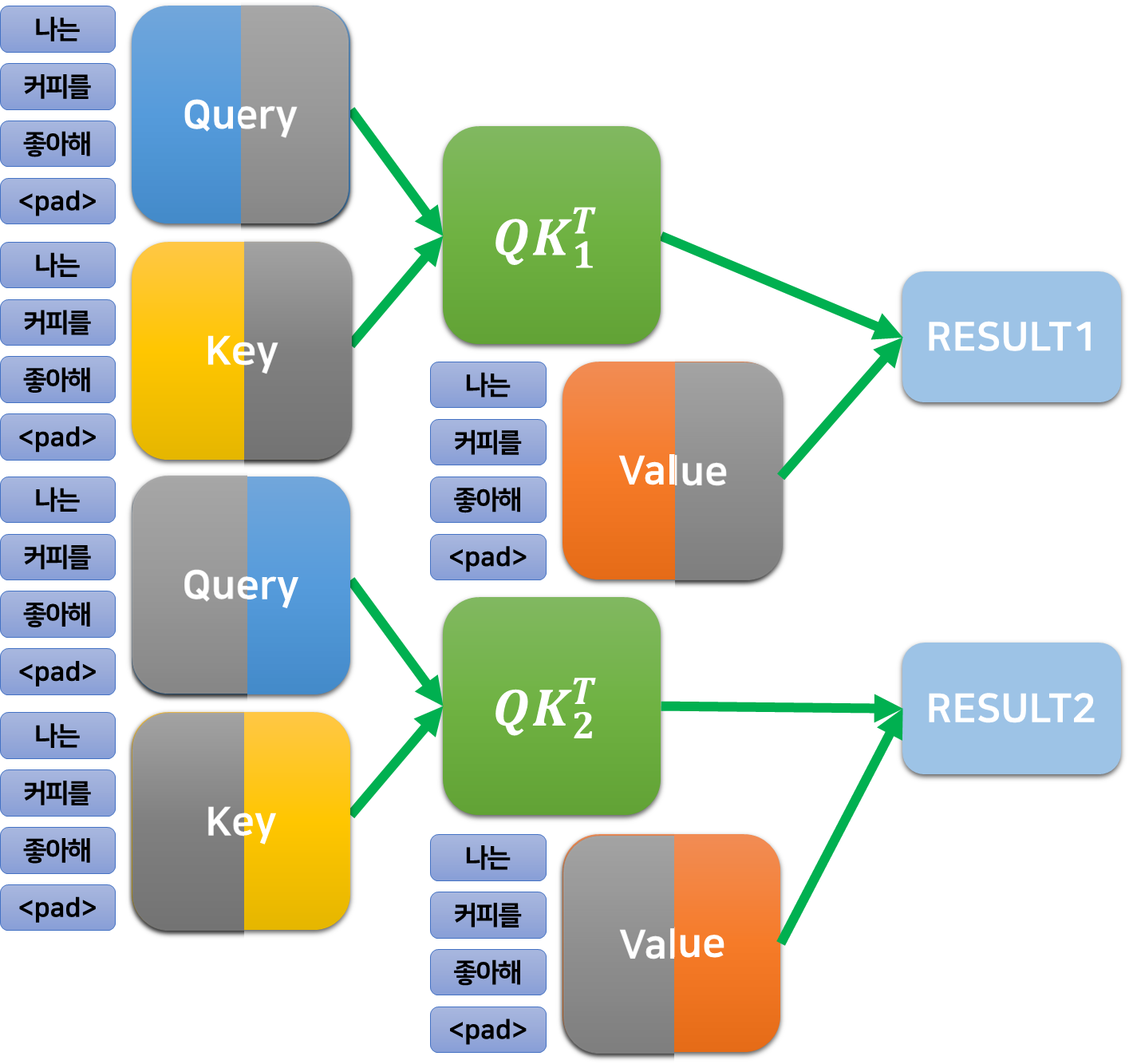 - 그 결과, 2개의 $512\times 512$의 $QK^T$, $QK^T_1, QK^T_2$가 얻어진다.