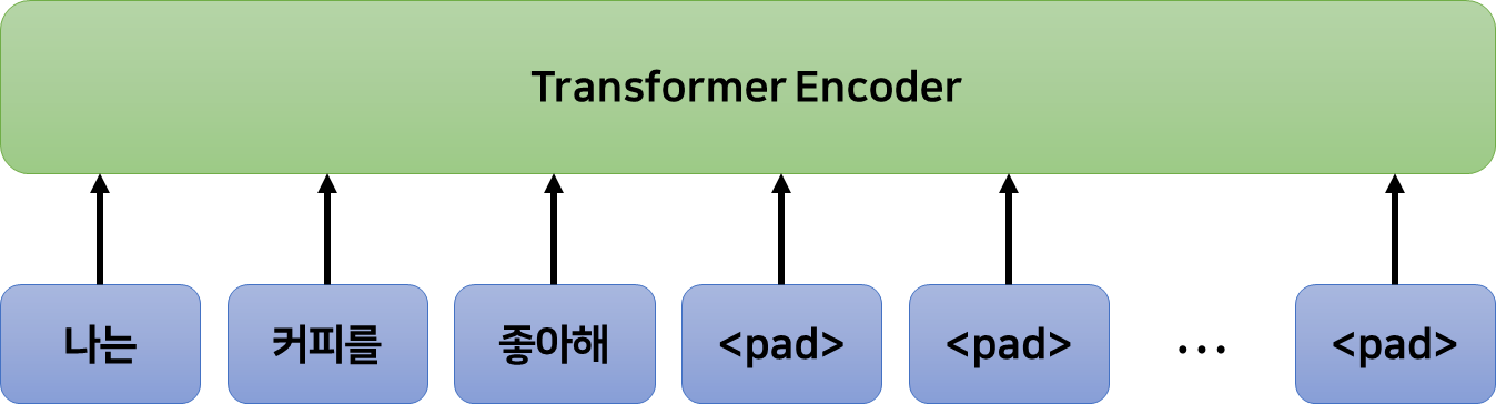 트랜스포머는 RNN 기반의 방법들과 달리 고정된 길이의 입력을 받는다. 논문에서는 최대 512개의 토큰을 입력으로 받기 때문에, 입력 데이터의 크기는 $512 \times m$이 된다.($m$은 임베딩의 크기) 입력하고자 하는 데이터가 512보다 작다면 남는 공간에는 <pad> 토큰을 넣고, 데이터가 512보다 크다면 분할하여 입력한다. (<pad> 토큰의 임베딩은 0이다.)