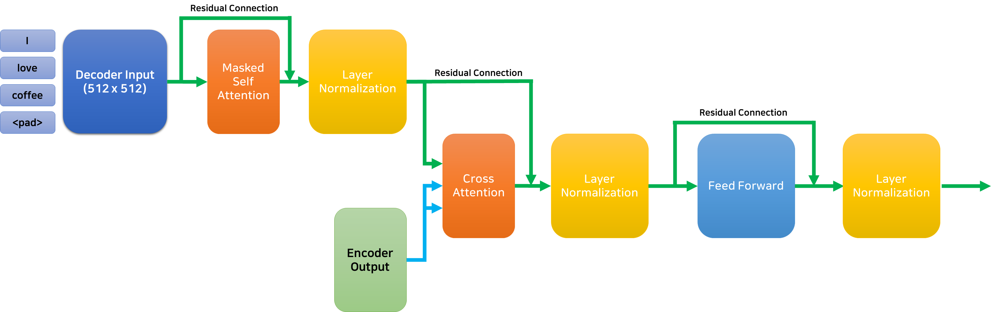디코더의 입력에 Self Attention을 적용한 후 인코더와 유사하게 Residual Connection과 Layer Normalization을 수행한다. 이렇게 디코더의 입력으로 얻은 행렬과 인코더의 출력 사이의 크로스 어텐션을 수행한다.