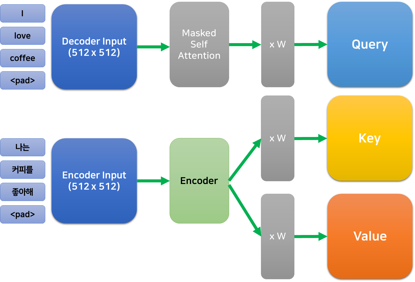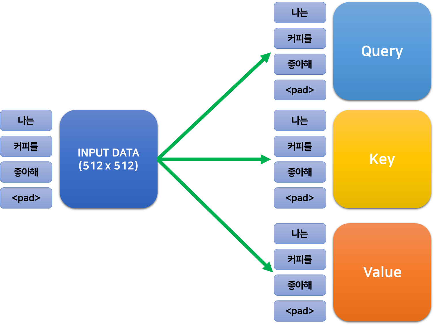 먼저 입력된 데이터를 세 개로 복사한 다음, 복제된 각각의 행렬에 어떤 (학습가능한) 가중치를 곱하여 세 개의 각기 다른 행렬로 만들어준다. 이때, 가중치는 $512\times 512$의 크기를 가지기 때문에 이렇게 얻은 세 가지 행렬 또한 인코더의 입/출력과 같은 크기를 갖는다.