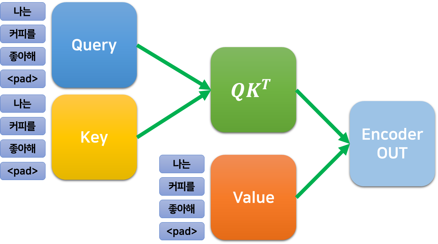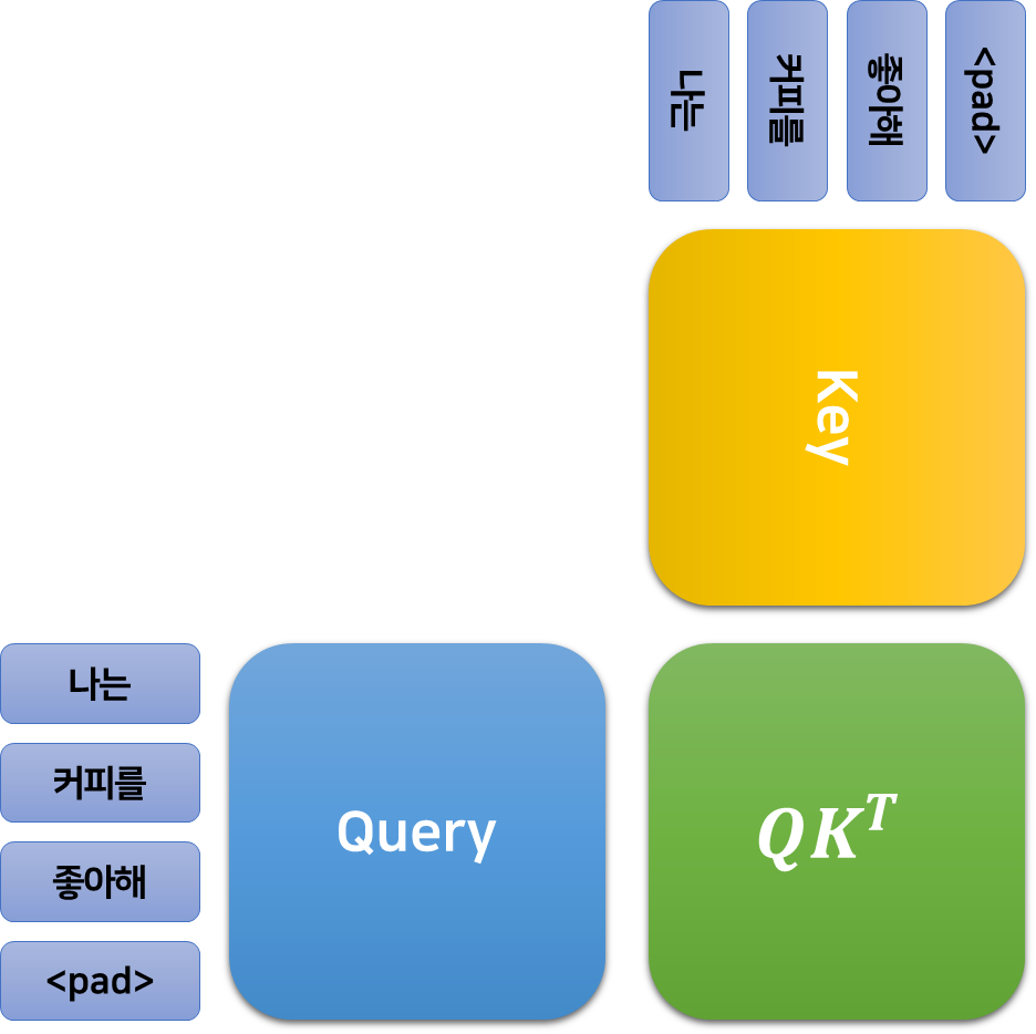 쿼리와 키의 내적으로 얻어지는 $QK^T\in\mathbb{R}^{512\times 512}$ 행렬의 값 $w_{i, j}$는 $i$번째 단어의 쿼리 벡터와 $k$번째 단어의 키 벡터의 곱의 내적과 같다.