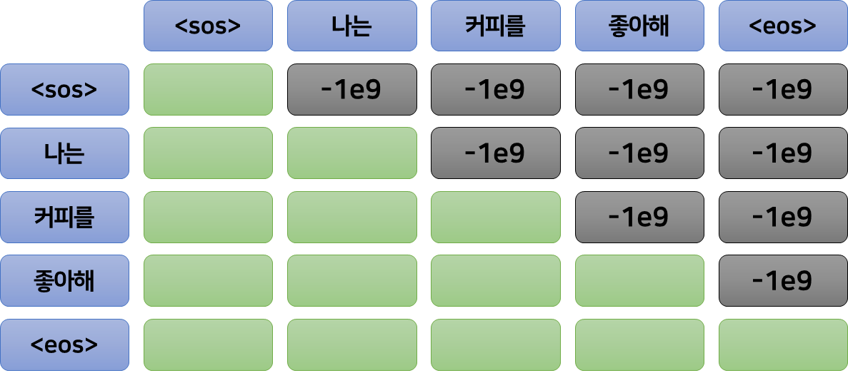위 그림과 같이, $QK^T$ 행렬의 대각 요소의 상단을 매우 작은 값(-1e9)로 masking 함으로써, 미래의 토큰에 대해서는 attention을 할 수 없도록 제한할 수 있다.