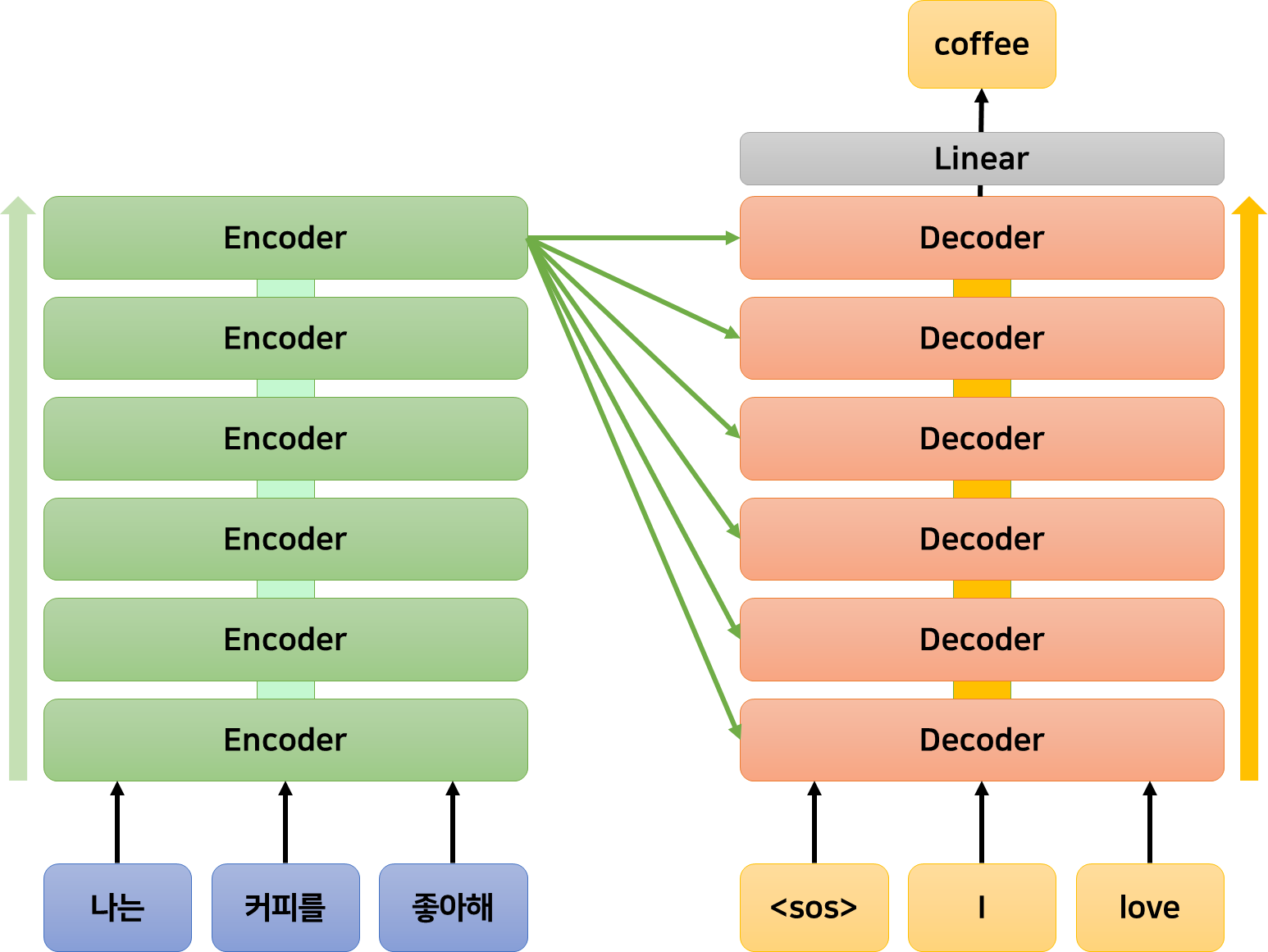 위 그림과 같이, 디코더는 인코더와 달리 이전 계층의 출력에 더불어 인코더의 마지막 출력을 입력으로 받는다.