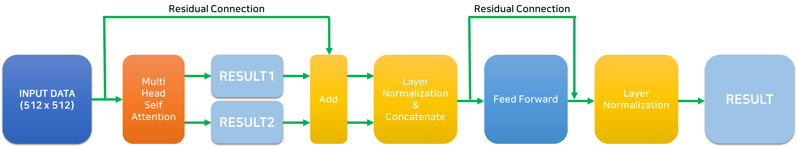 앞서 Multi-Head Attention의 결과로 여러 개의 Attention 결과 행렬을 얻었다. 이를 concatenate 하기에 앞서, Residual Connection과 Layer Normalization을 적용해 준다.