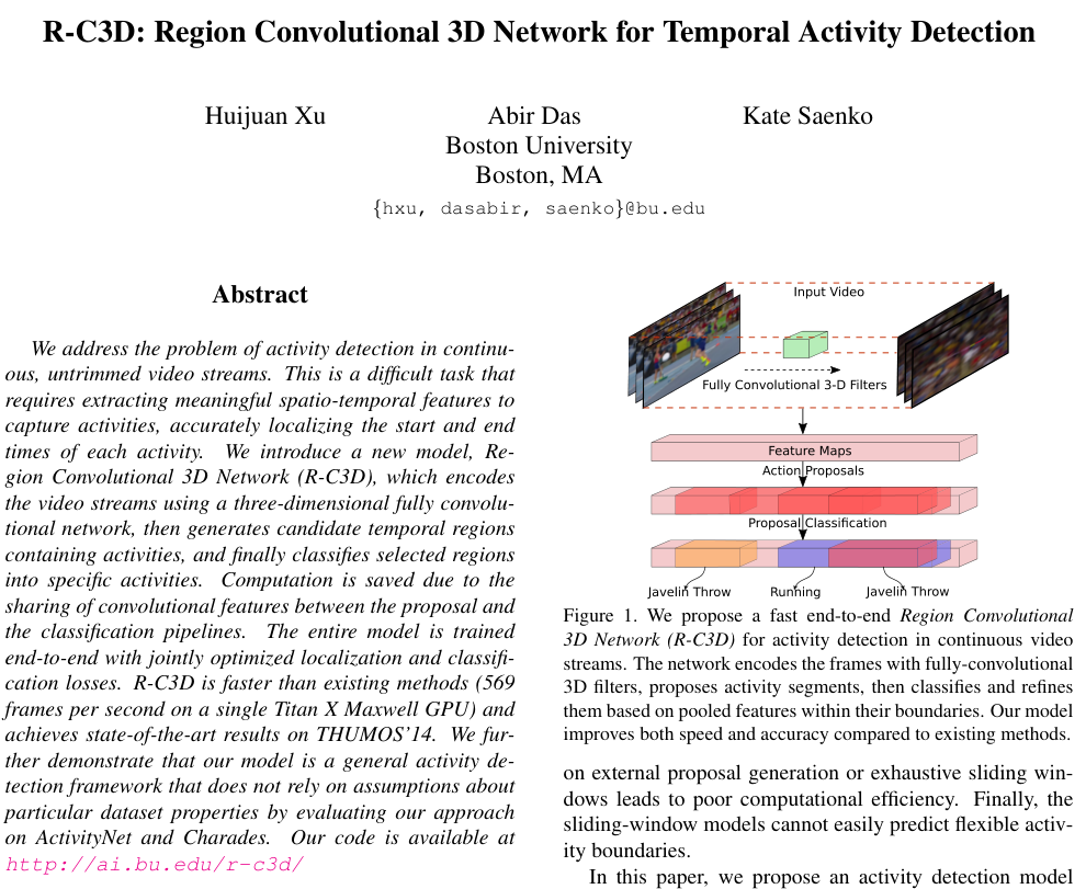 이 논문은 2017년 ICCV에 제출된 논문으로, untimmed video 내에서 어떤 action의 class를 분류하고, 해당 action이 등장하는 구간을 판별하는 Action Detection(Localization) 문제를 다룬다. 저자들은 end-to-end로 학습 가능하며, 합성곱 계층으로만 구성된 모델인 Region Convolutional 3D Network, R-C3D를 제안한다. 이 모델은 THUMOS 2014 데이터셋에서 기존 모델들보다 빠르며, SOTA를 달성하였다.