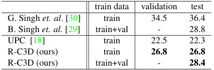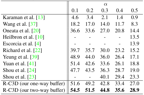 저자들은 THUMOS'14 데이터셋에서 다른 모델들과의 비교를 수행하였다. 그 결과 R-C3D는 SOTA를 달성하였다. 저자들은 학습 단계에서 GPU memory의 제한으로 인해 영상을 처음부터 끝까지 sliding하며 분할하여 버퍼에 입력한 one-way buffer 방법을 사용하고, 여기에 더하여 영상을 뒤에서부터 처음까지 sliding한 것을 추가한 two-way buffer 방법으로 실험을 진행했다.