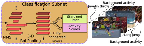이렇게 얻어진 고정된 크기의 특성은 두 개의 fully connected layer에 입력되어 각각 action의 시작, 종료 시간 회귀와 action의 종류 분류를 수행한다.