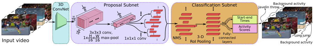 R-C3D는 위 그림처럼 크게 3가지 요소로 나누어진다. 특성을 추출하는 3D ConvNet Feature Extractor, action이 있을 것 같은 영역을 찾아내는 Proposal Subnet, 영역들이 가지고 있는 action을 분류하고 refine하는 Classification Subnet이다. 연산의 효율을 위해 Proposal Subnet과 Classification Subnet은 같은 3D ConvNet에서 추출된 특성을 사용하며, 이 논문의 핵심은 Faster R-CNN에서 사용한 2D ROI pooling을 3D로 이식하여 가변적인 길이의 영역을 proposal할 수 있게 한 것이다.